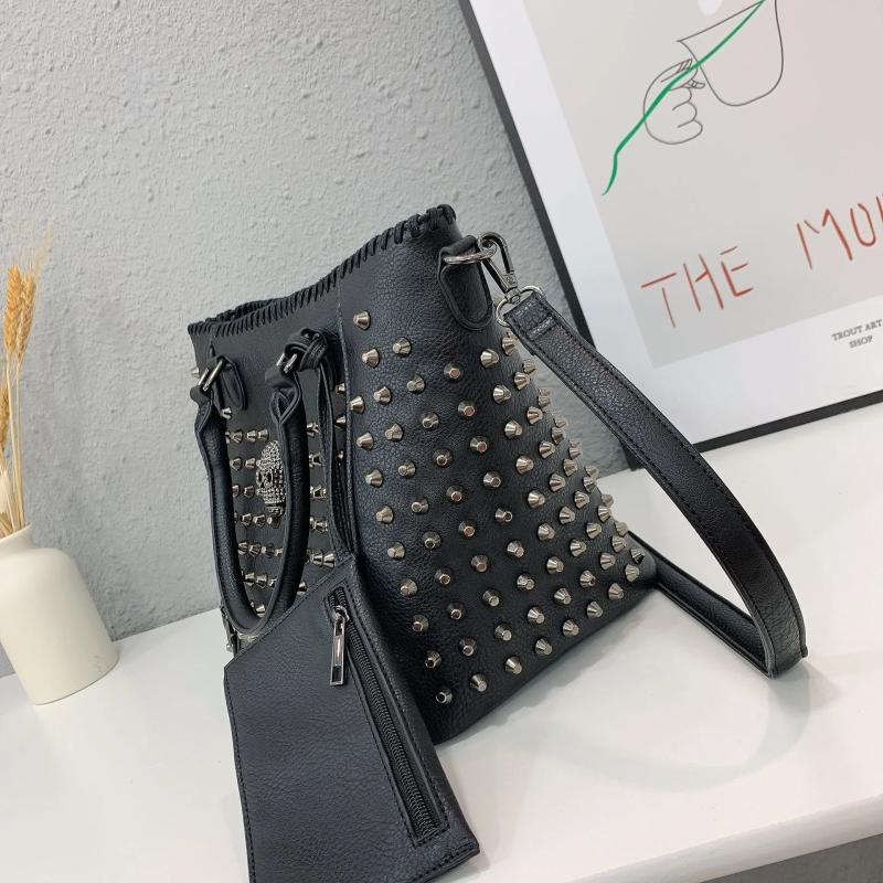 2Pcs Women's Crossbody Bag Pu Leather Skull Rivets Bucket Shoulder Handbags