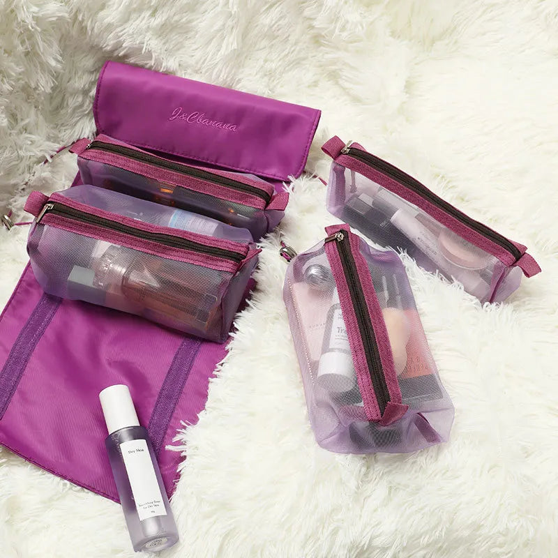This set includes 4 multifunctional cosmetic bags that are perfect for travel. They offer large storage capacity and are great for organizing your makeup and toiletries. The bags are foldable for easy storage and come in a stylish design.