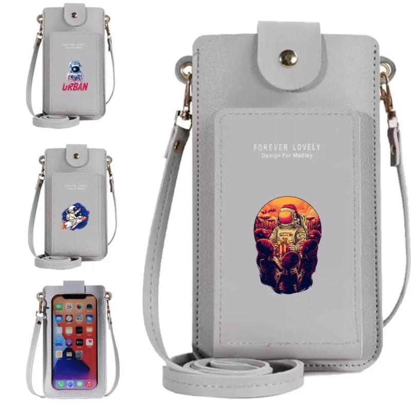 This PU leather phone bag wallet features an astronaut print design, suitable for storing ID cards, bank cards, and cell phones. It can also be worn as a shoulder bag.