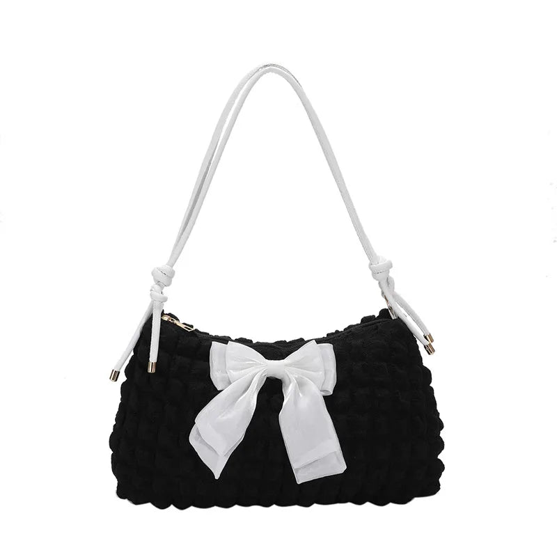 This sweet bowknot shoulder bag is perfect for female girls. It features a pleated plaid design in a beige color, making it a stylish accessory for any outfit.