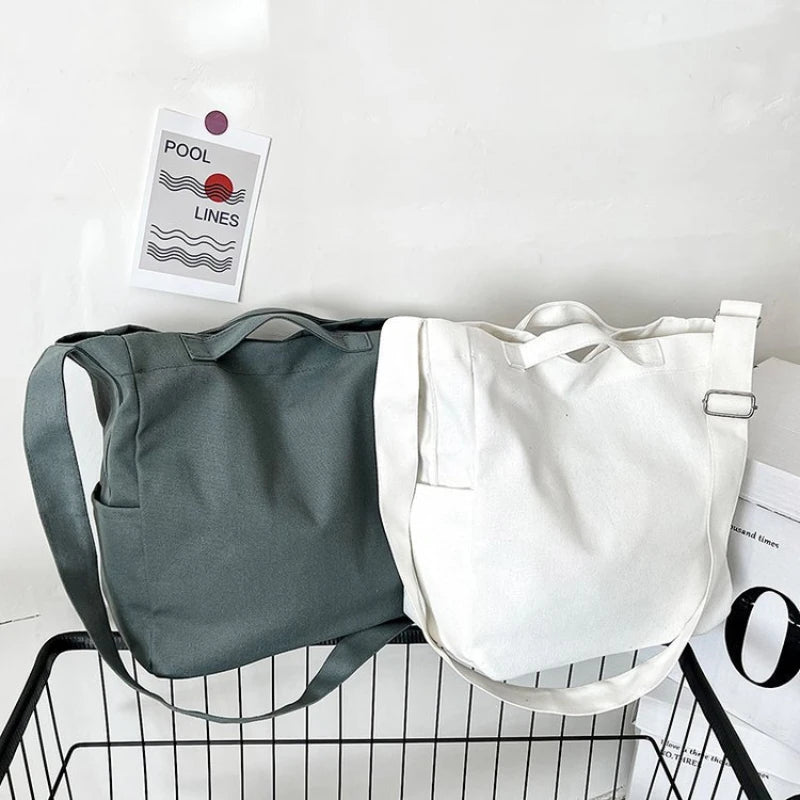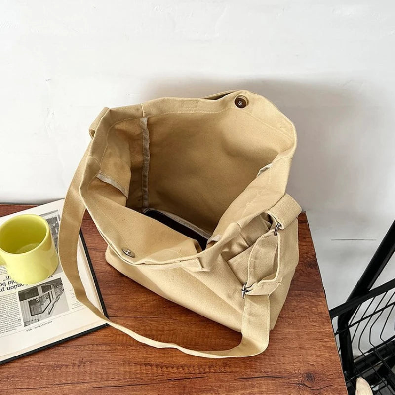 This stylish canvas handbag is perfect for women on-the-go. It offers a large capacity, solid color design, and can be worn as a shoulder bag or crossbody. Ideal for casual outings and shopping.
