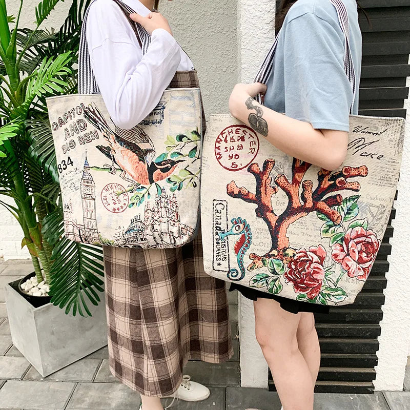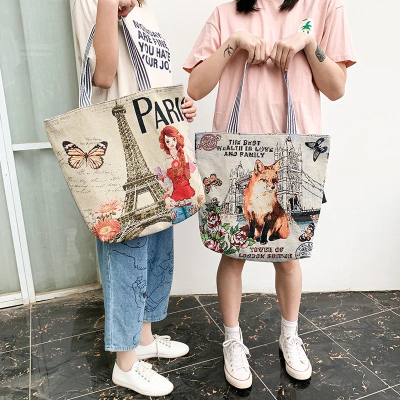 Canvas Handbag Birds Owl Butterfly Print Shoulder Tote Bag