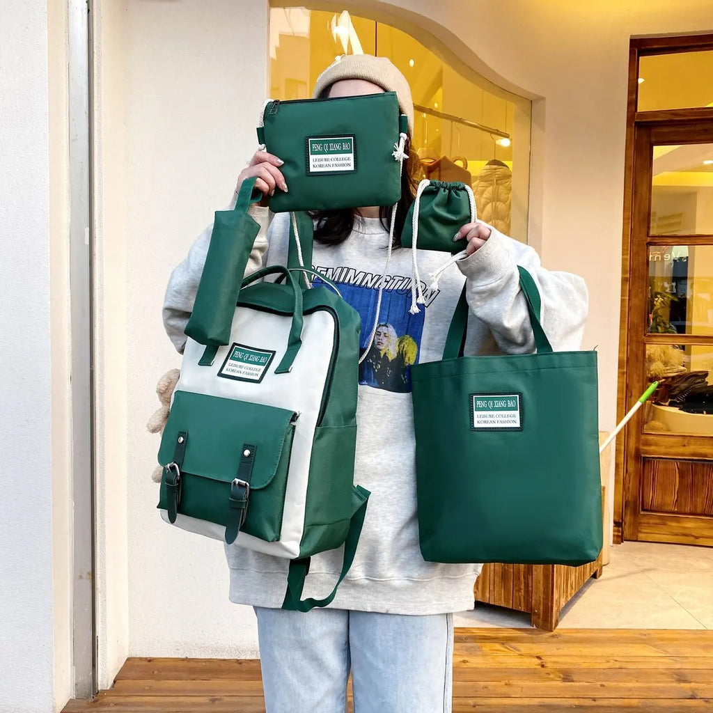 This 5-piece backpack set includes a stylish canvas backpack perfect for teenage girls going to high school or traveling. It is designed for teen students and provides ample storage.