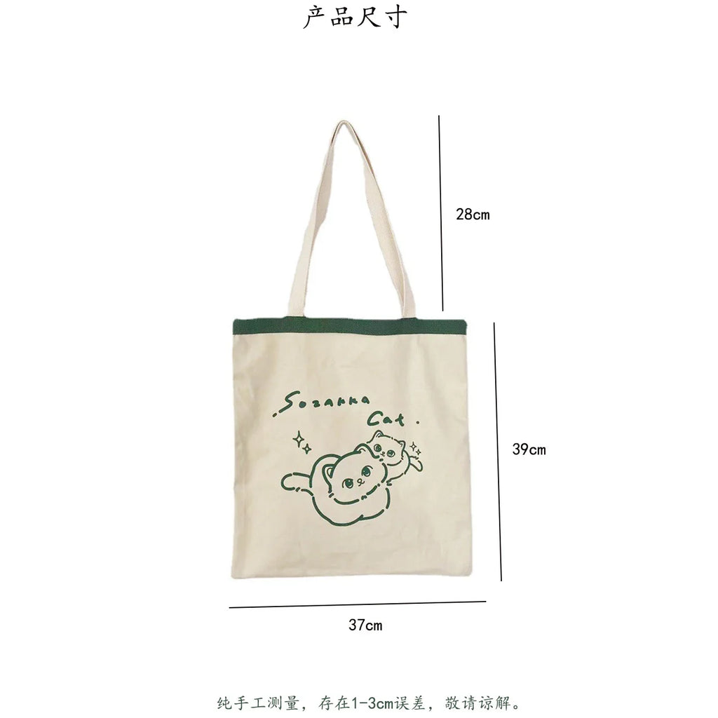 This women's canvas tote bag is made of cotton cloth, perfect for shopping or carrying essentials. It features a cute cartoon design and is spacious for all your items.