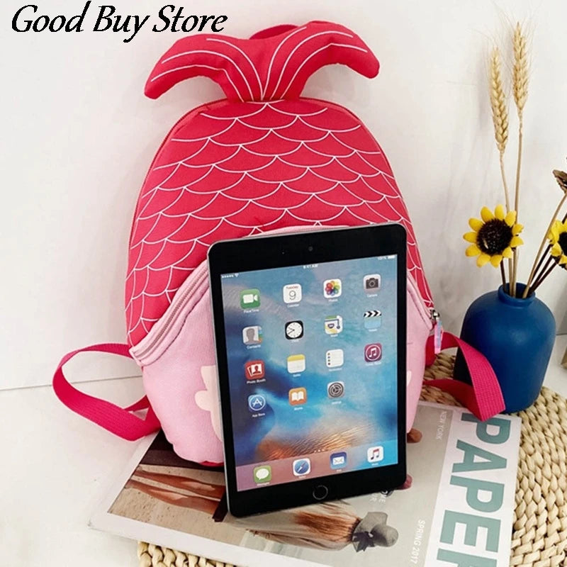 Adorable backpack purse designed with cartoon fish pattern, perfect for kindergarten children. Also suitable for carrying books and school supplies.