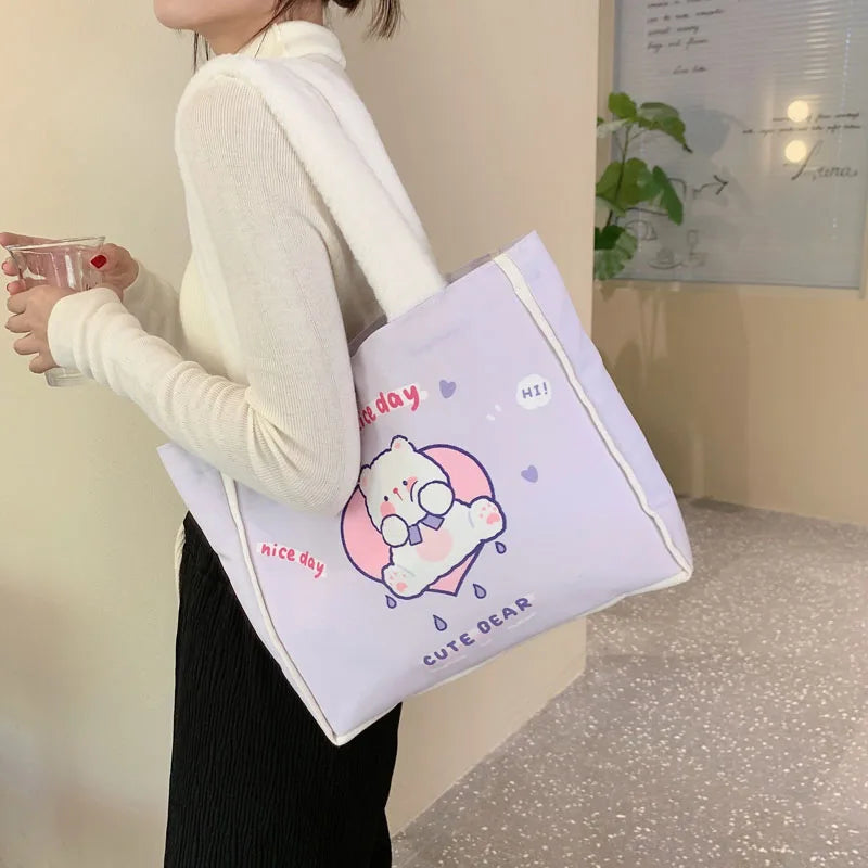 Adorable girl student handbag with a cute cartoon pattern design. This plush shoulder bag features a hand strap for easy carrying and a large capacity for all your essentials.