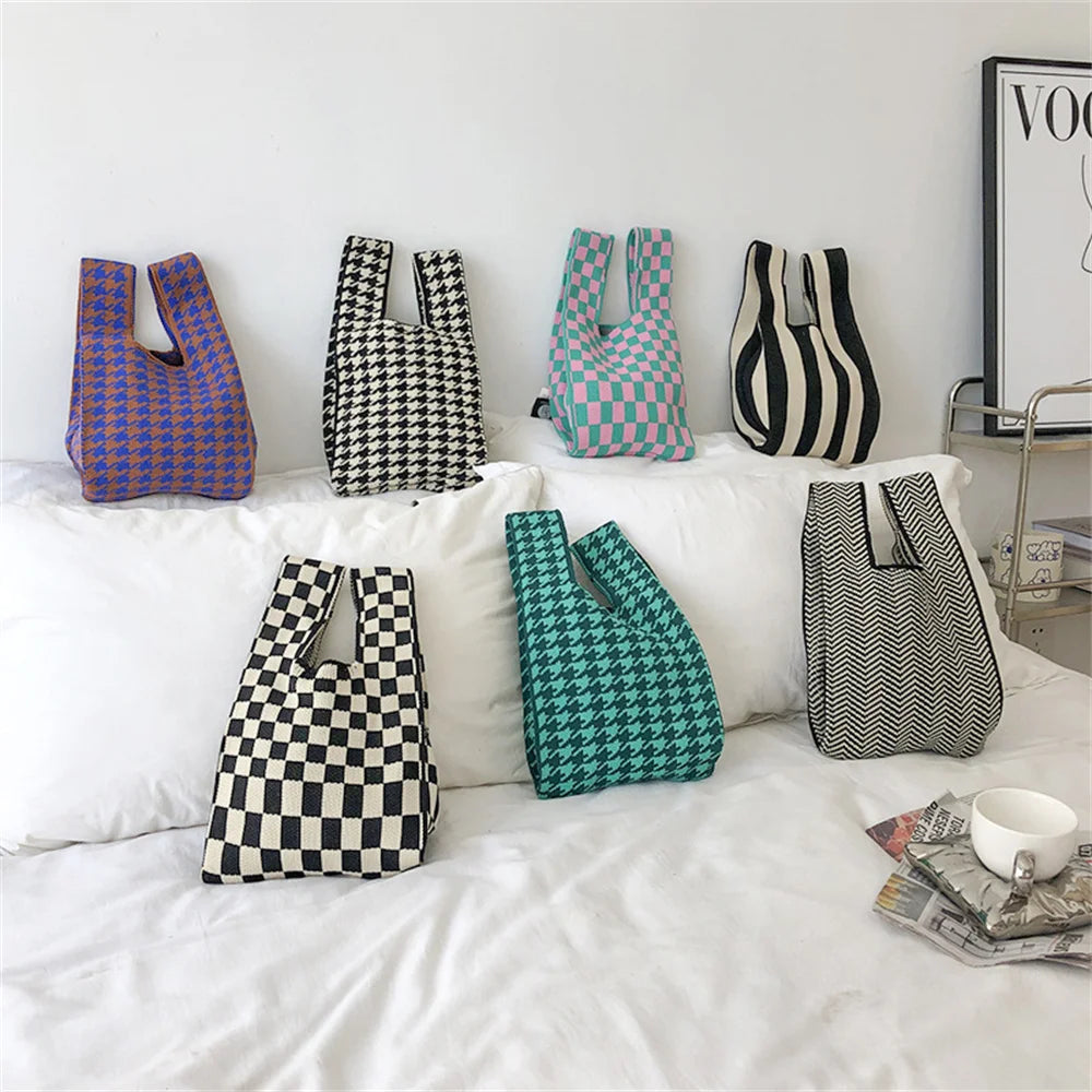 Stay stylish with this knitted checkerboard handbag for women. Ideal for casual outings and shopping, this small tote bag features a trendy plaid houndstooth design.