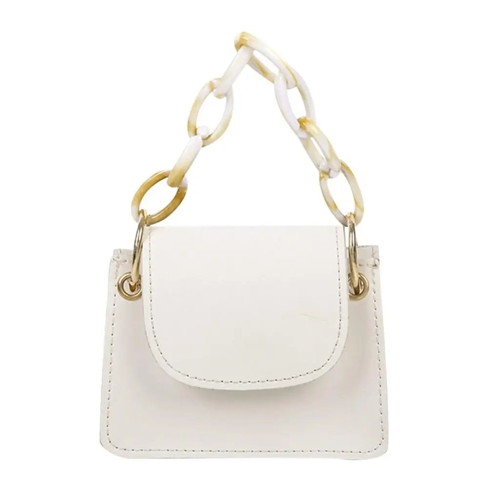 This stylish crossbody bag is made of high-quality PU leather and features an eye-catching acrylic chain shoulder strap. The perfect accessory for on-the-go chic.