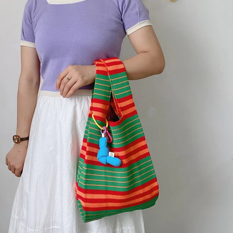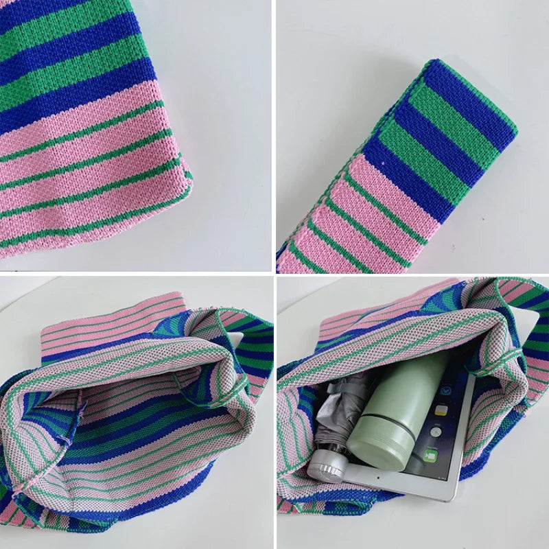 Colorful Stripe Messenger Bag Knitted Cotton Tote