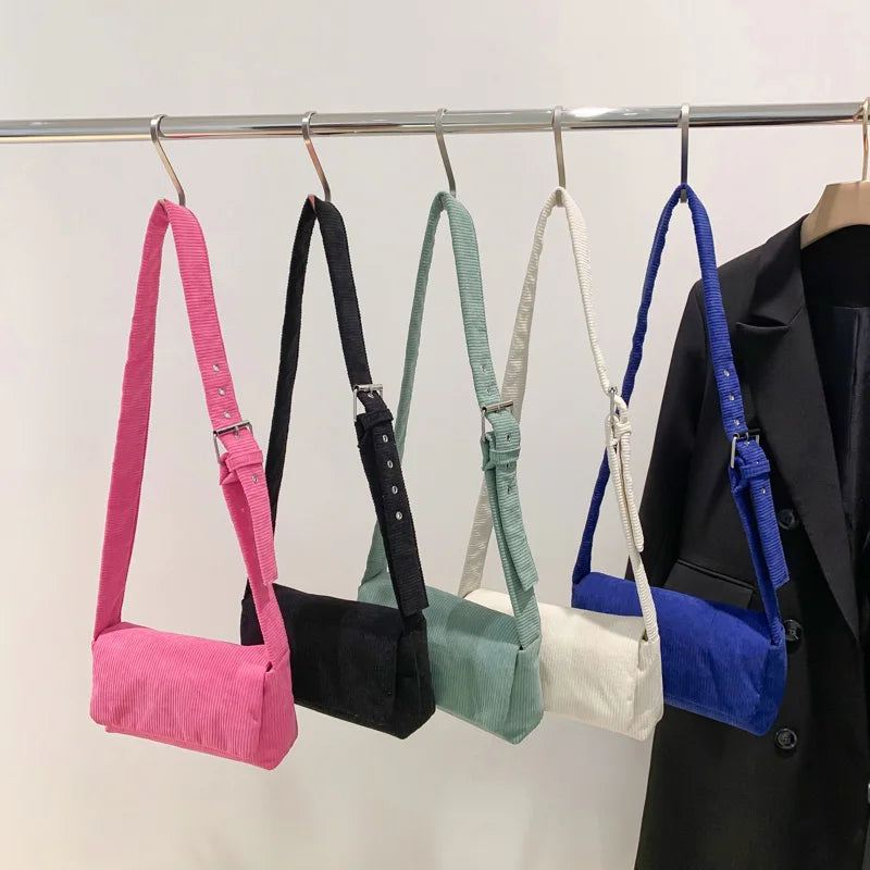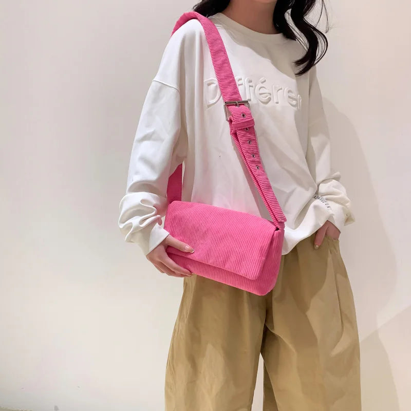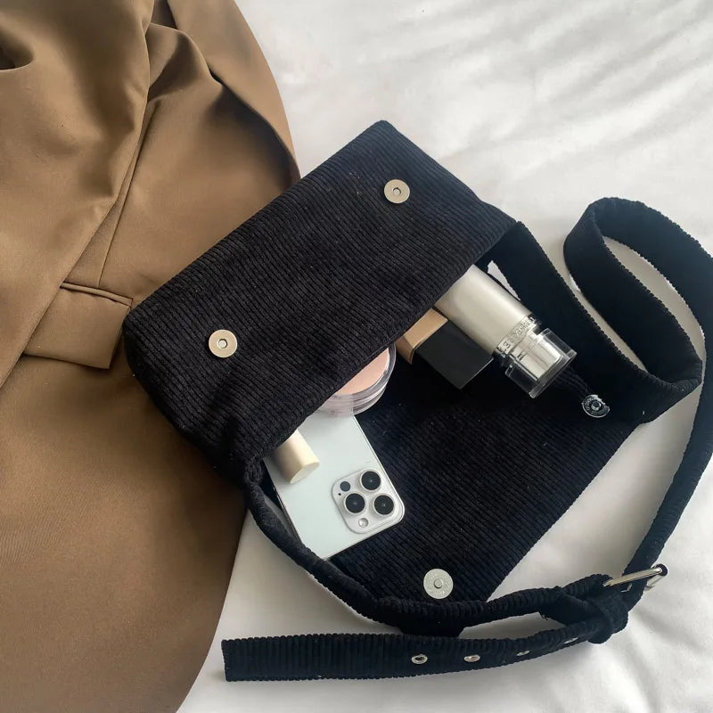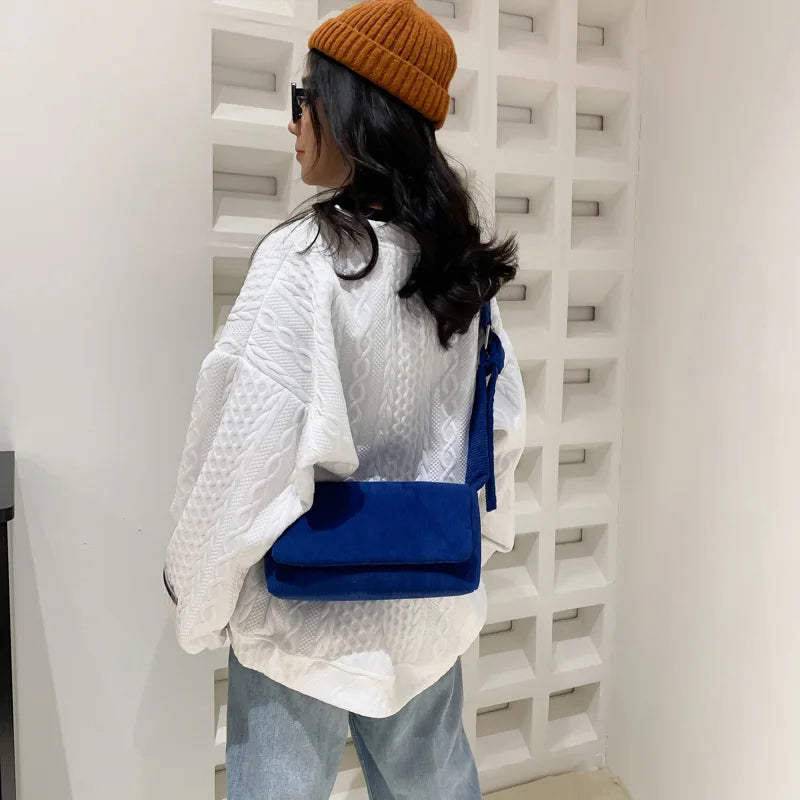 Stay fashionable with this stylish corduroy crossbody bag, featuring a square flip design. Perfect for everyday use, this bag is versatile and trendy, making it a must-have for any woman.