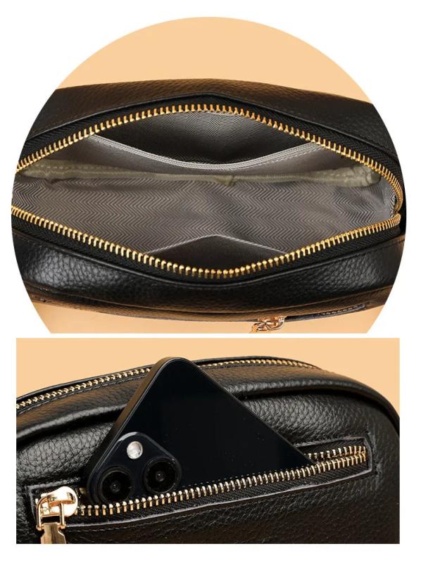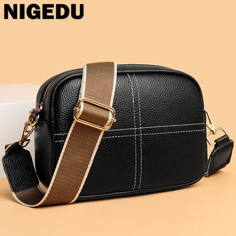 This stylish cowhide leather shoulder bag is perfect for daily use. It features a wide strap for comfort and convenience. The bag is spacious enough to carry your phone, wallet, and other essentials.