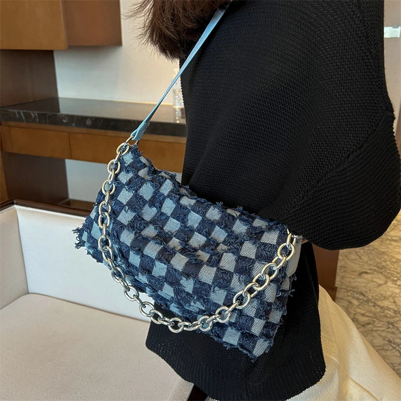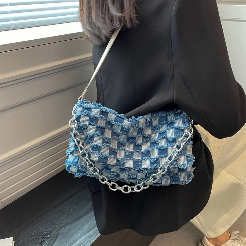 Stylish and practical denim crossbody bag with tassels and silver chain for women. Perfect for travel, shopping, and everyday use.