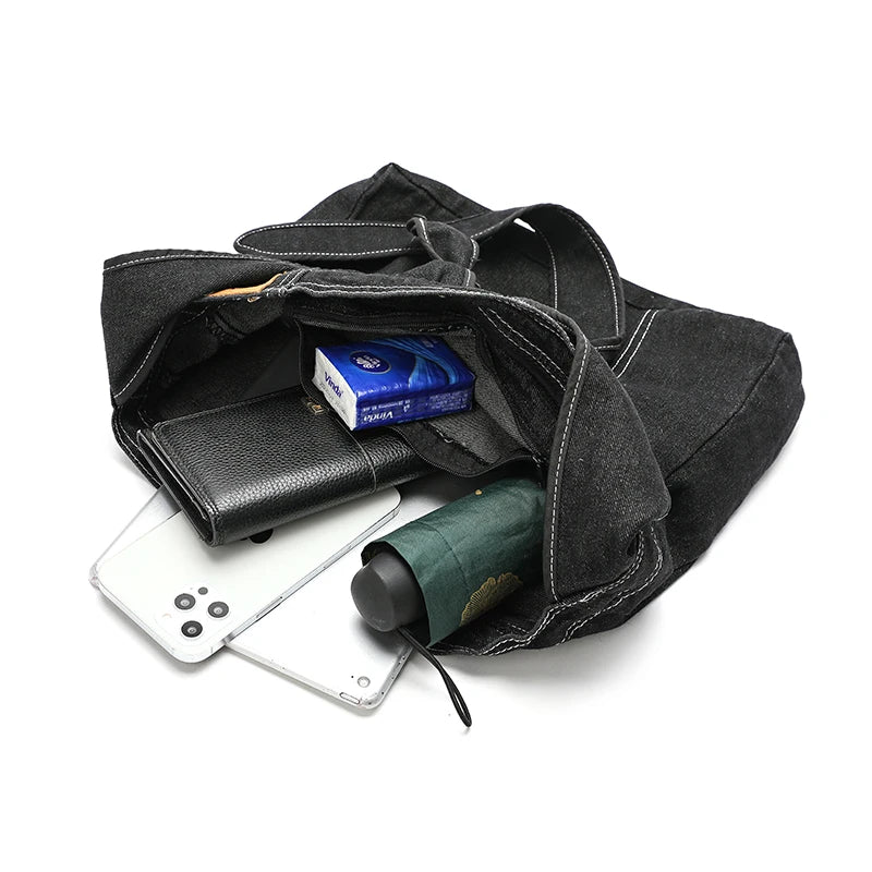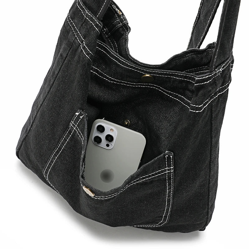 This large capacity shoulder bag is perfect for the youth with a casual denim design. It features two layers for ample storage space and is a stylish accessory for everyday use.