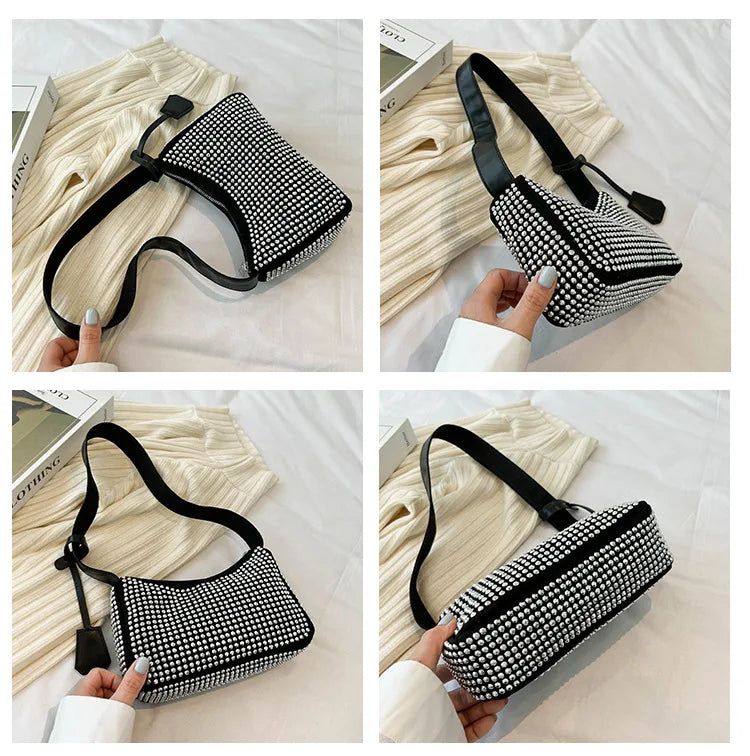 Elegant and stylish handbag adorned with shimmering diamonds, perfect for any occasion.