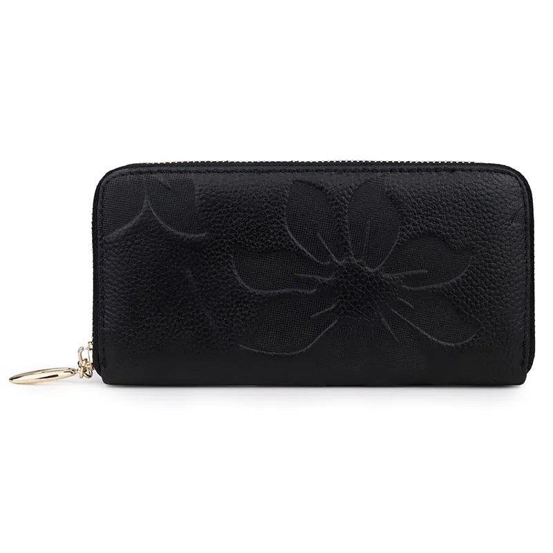 Stay stylish and organized with this European and American design women's wallet. Featuring a beautiful embossing flower pattern, this wallet has a zipper closure and a convenient cell phone pocket. Keep your essentials secure and trendy with this new arrival.