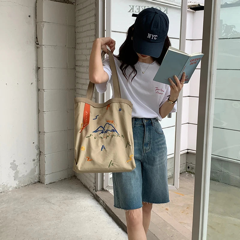 Embroidered Webbing Women Canvas Shoulder Bag Tote for Girls