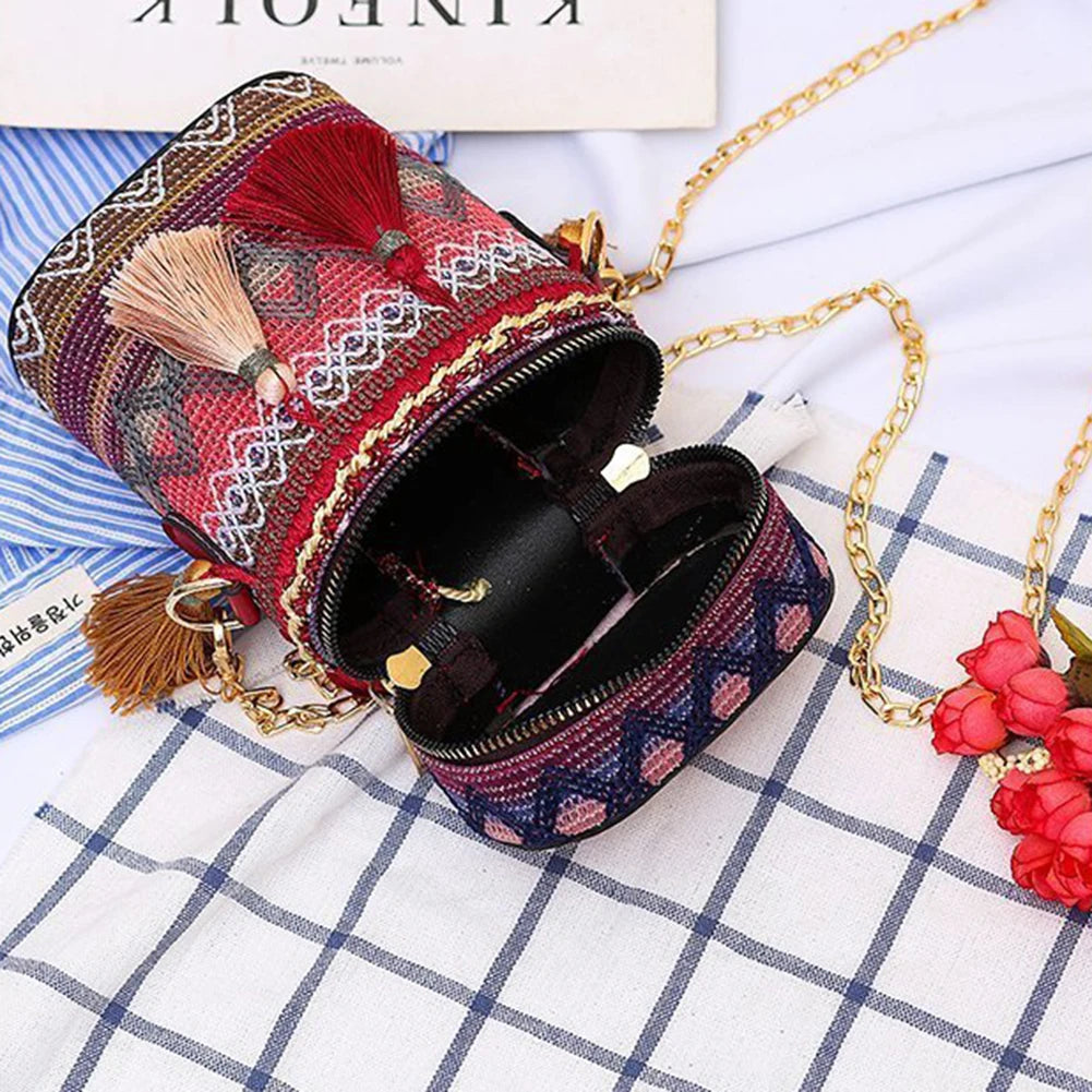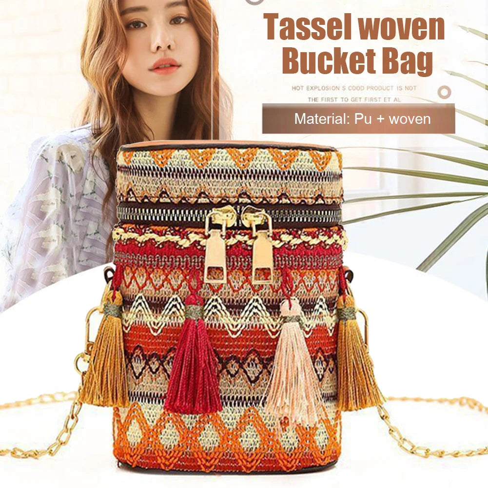 Get ready for vacation with this ethnic style bucket shoulder bag. It features tassel chain design, perfect for shopping and leisure activities.