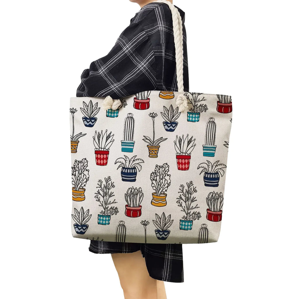 Stay stylish with this high-capacity cactus tote bag perfect for outdoor travel, beach trips, and shopping. The floral print adds a touch of elegance to your look.