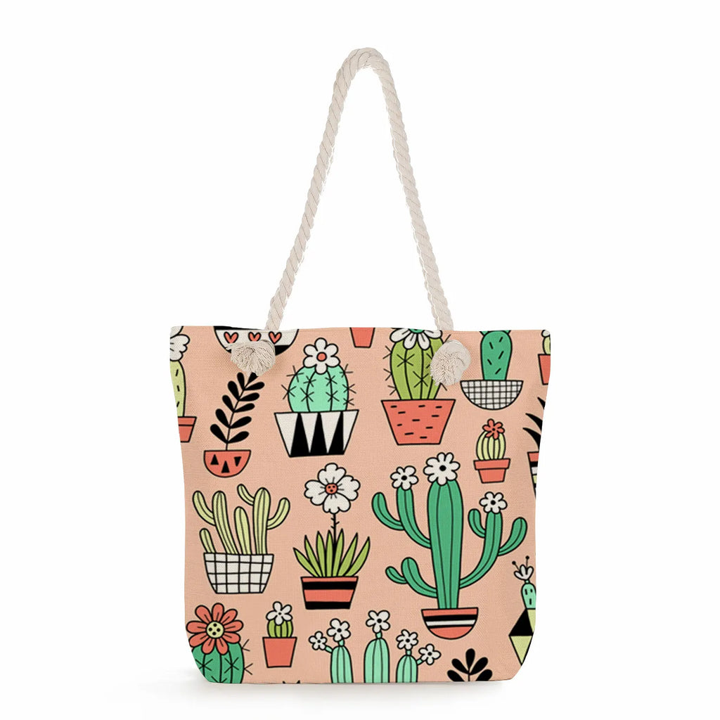 This thick rope shoulder bag is perfect for outdoor travel, beach trips, and shopping. It features a high capacity design with a beautiful floral print and cactus motif, making it a stylish accessory for women.