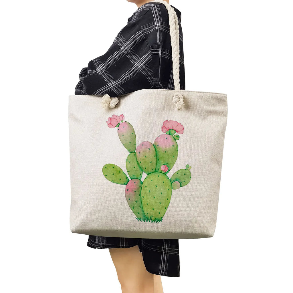 Floral Print Cactus Tote Bag Shoulder High Capacity Shopping Handbag