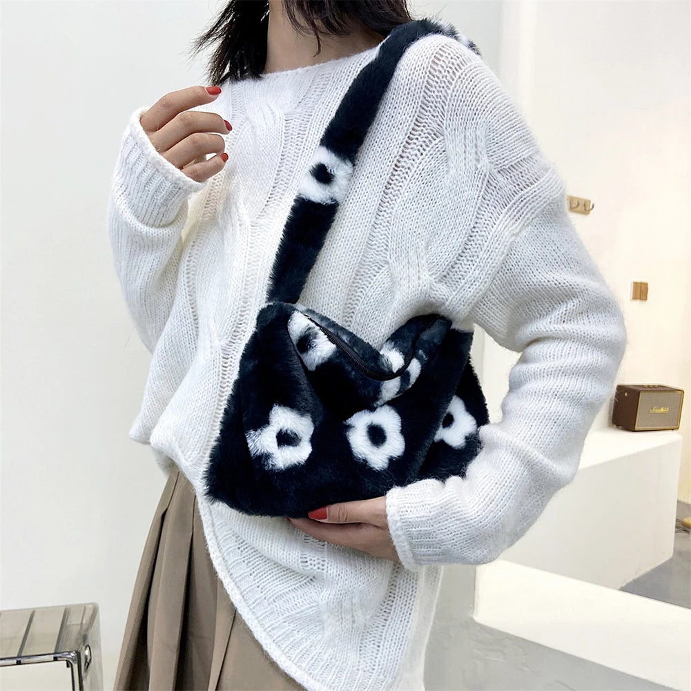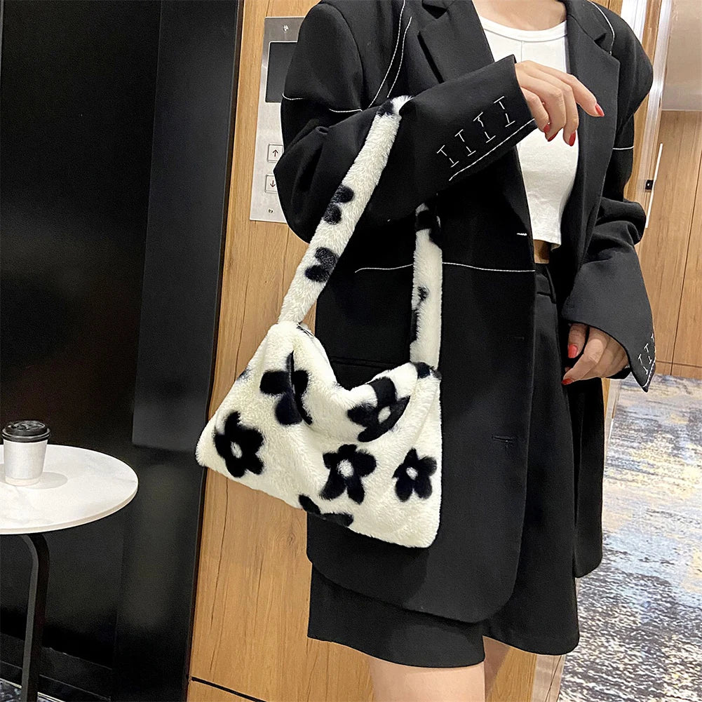 Flower Heart Print Shoulder Bag Plush Handbags Women Autumn Winter