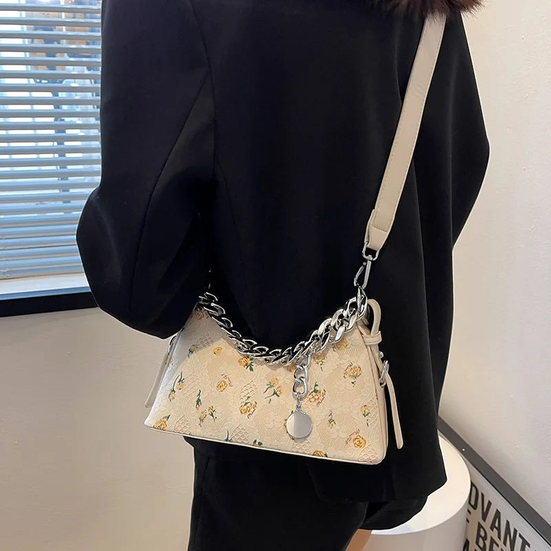 This stylish women's half moon tote bag features a floral print design, perfect for evening parties and special occasions.