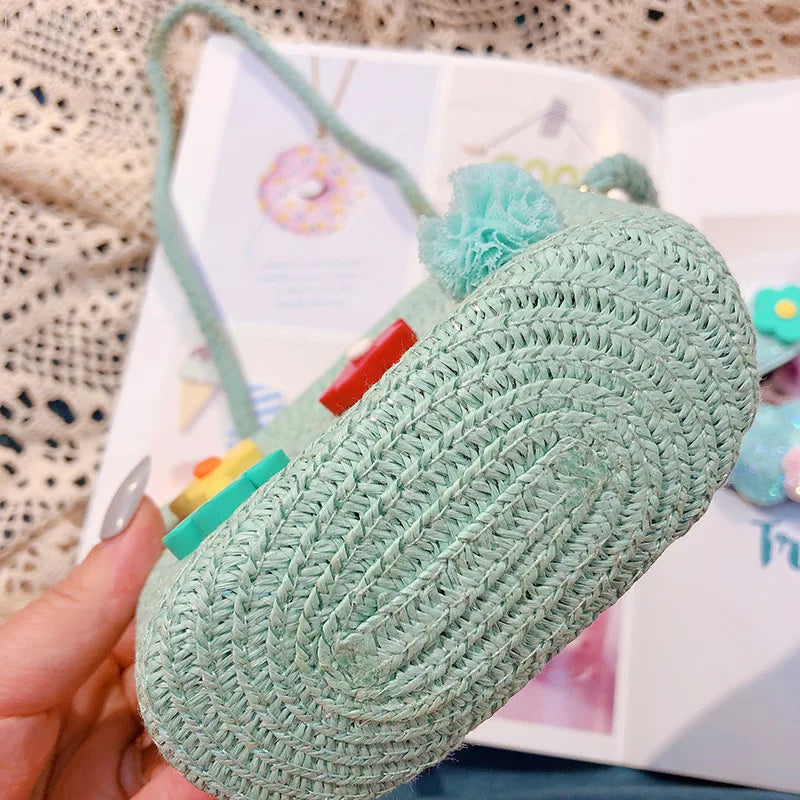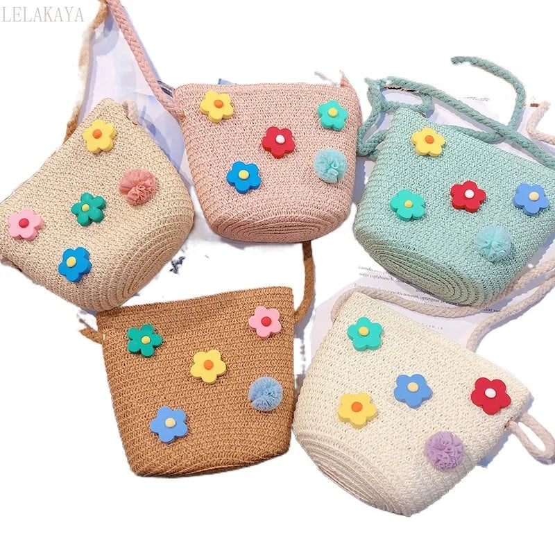 Flower Straw Bucket Bag Women Shoulder Messenger Woven Beach Travel Mini Purse
