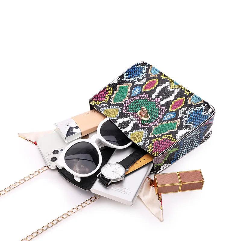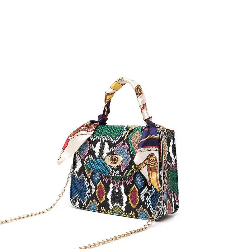 This summer handbag features a stylish snake pattern design with a scarf lock chain. It is perfect for carrying your essentials in style.