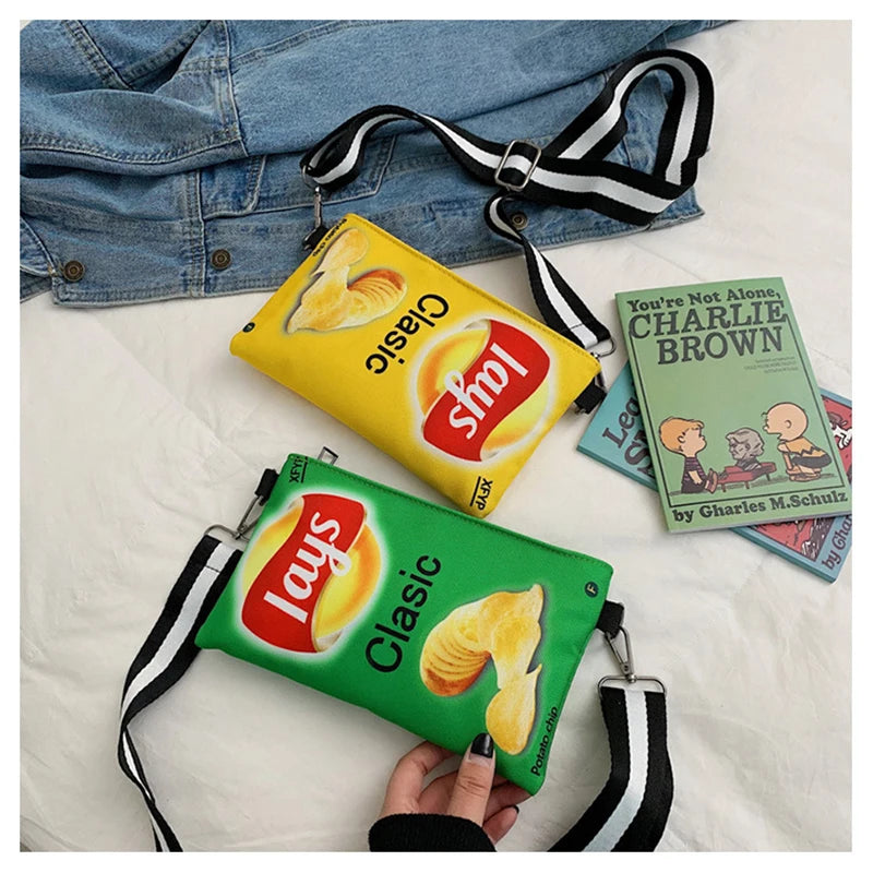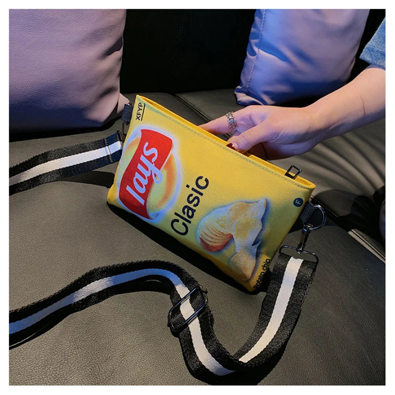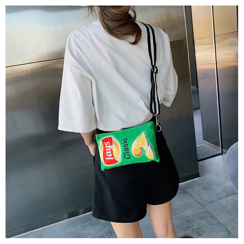 This canvas mini crossbody bag features a humorous potato chips design perfect for adding a quirky touch to your outfit.