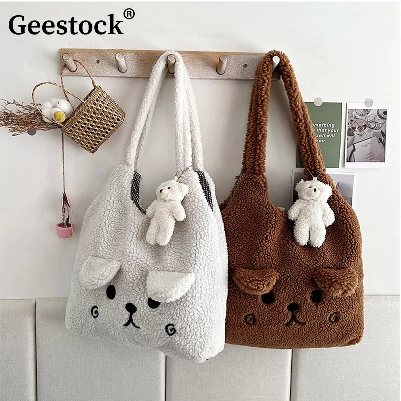 Geestock Winter Plush Bag Cartoon Embroidery Lamb Hair Shoulder Bags