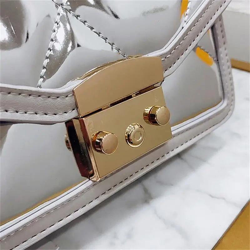 This stylish handbag features glossy PU material with detailed stitching and a metal lock flap. It can be worn as a shoulder or messenger bag.