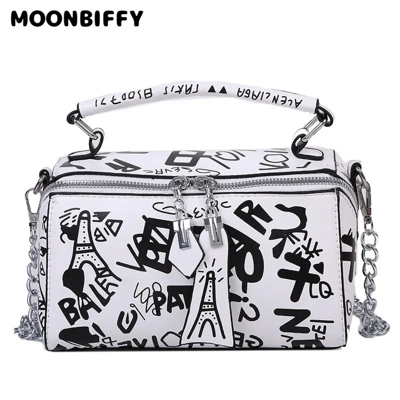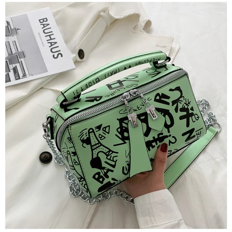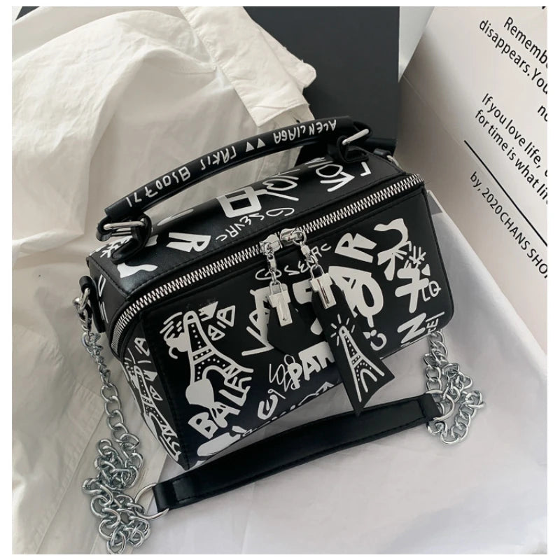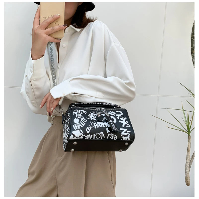 This stylish crossbody bag features a graffiti design, perfect for shopping or party wear. It can be worn as a shoulder bag or a single shoulder crossbody bag.
