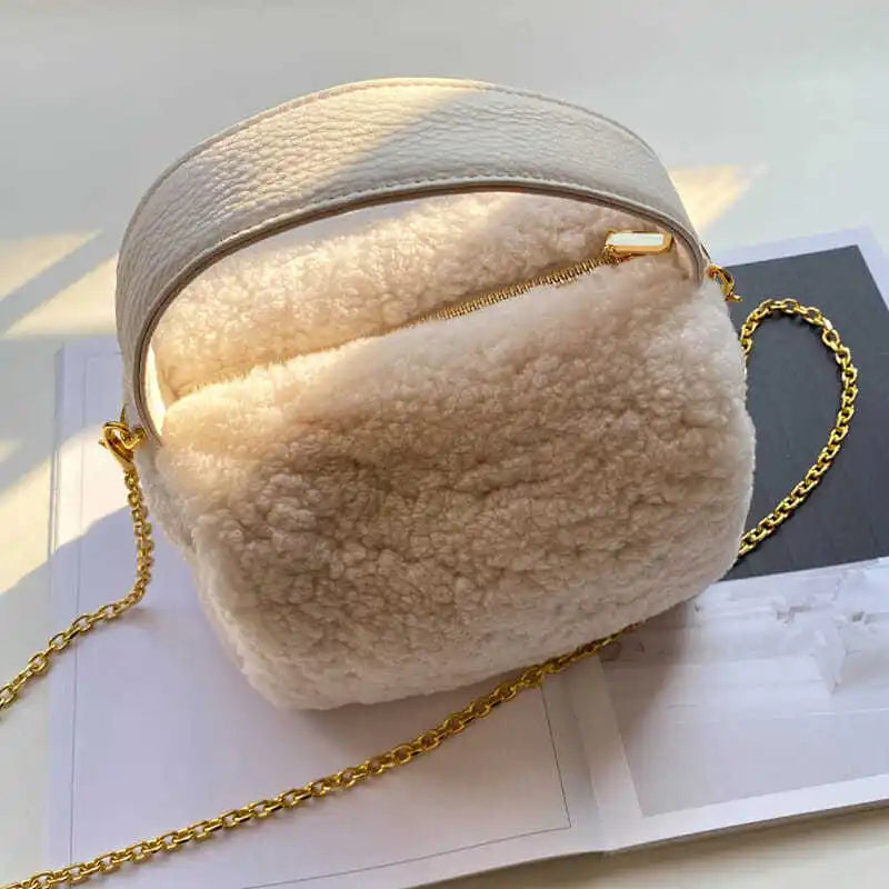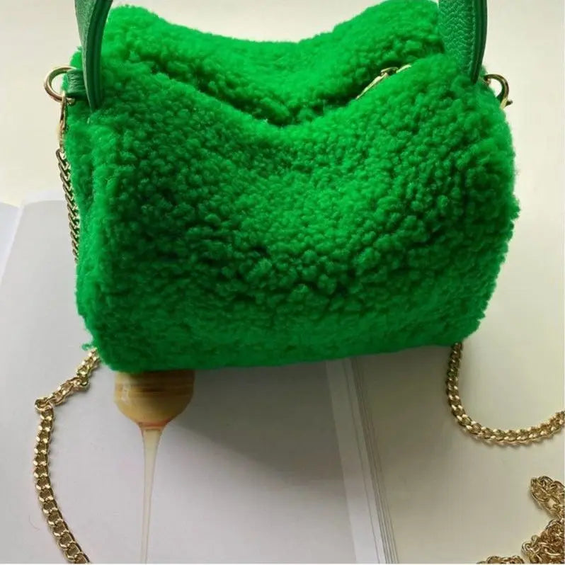Stay stylish with this green lambswool and PU leather shoulder bag that is perfect for carrying your lunch box, cosmetics, and other small items. The plush design adds a touch of luxury to your outfit.