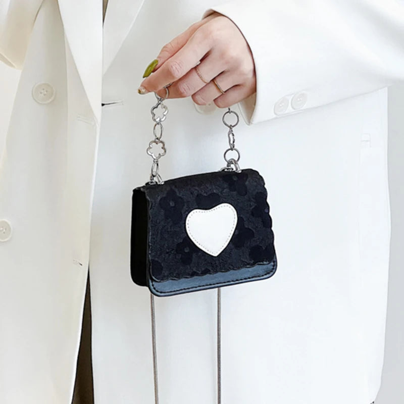This stylish shoulder bag features a heart patchwork design, perfect for adding a touch of charm to your outfit. It is made of high-quality PU leather and comes with a chain strap for easy carrying.