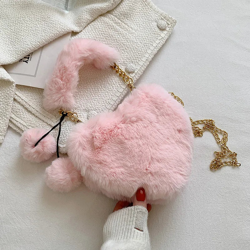 Heart Shape Plush Bag Metal Chain Shoulder Bag