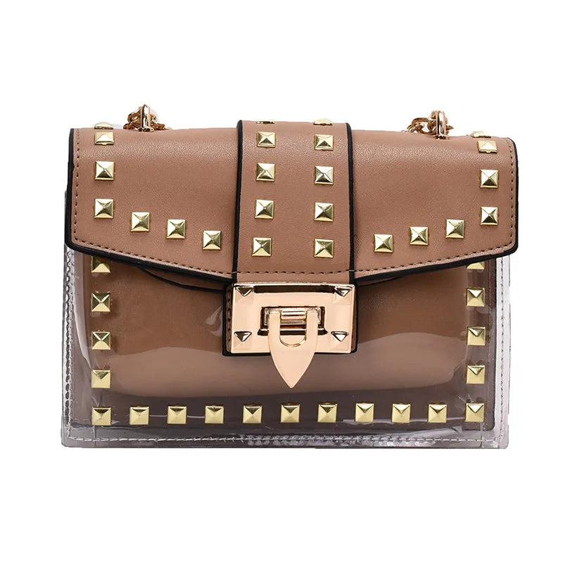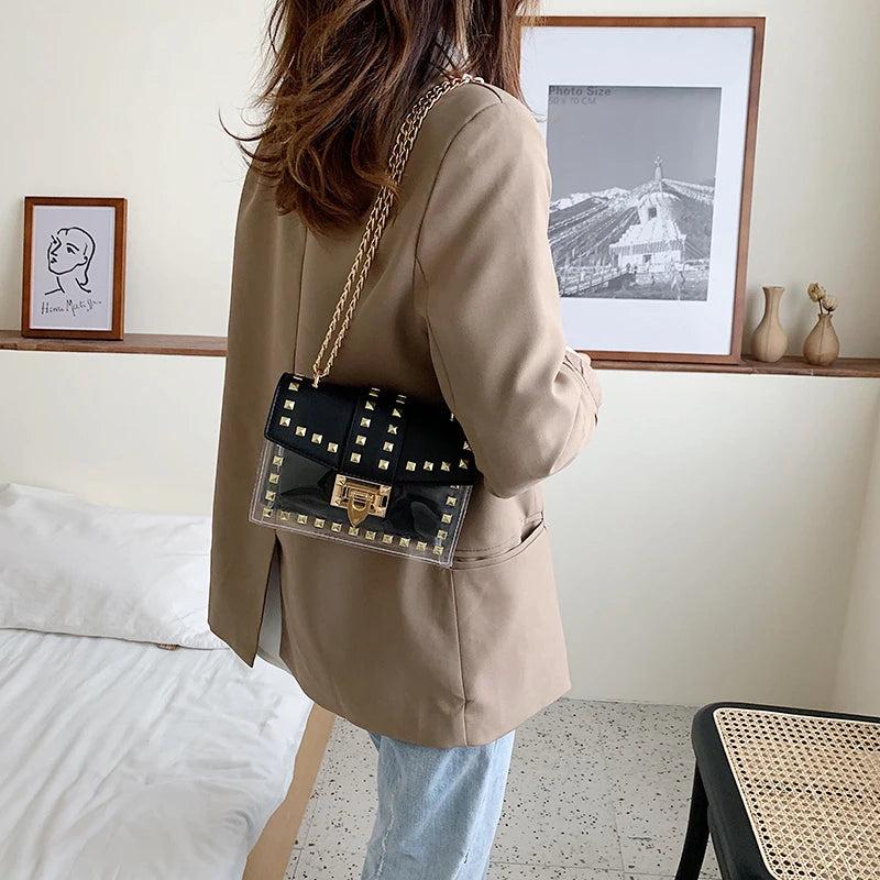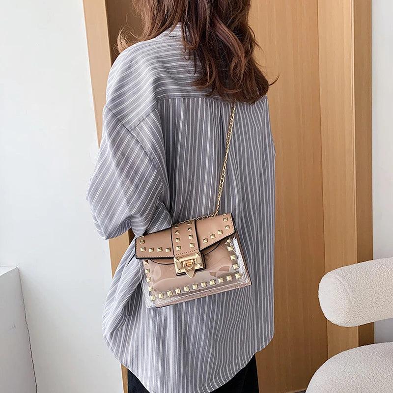 This stylish crossbody bag is made of premium PU leather, featuring rivet accents. Perfect for daily use, shopping, and outings.