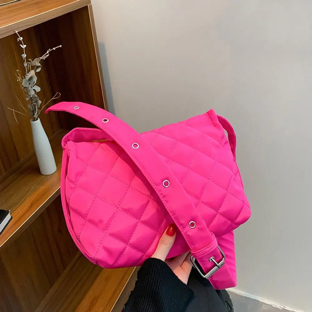 Stay warm and stylish this winter with this quilted shoulder bag. Made from down cotton padding with a plaid design, it features a zipper closure for security.