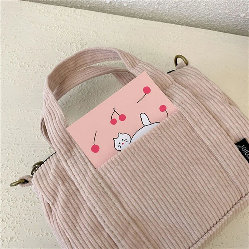 This women's mini corduroy shoulder bag is perfect for everyday use. It features a zipper closure and is made of durable canvas material. The stylish design makes it a must-have accessory for any girl.