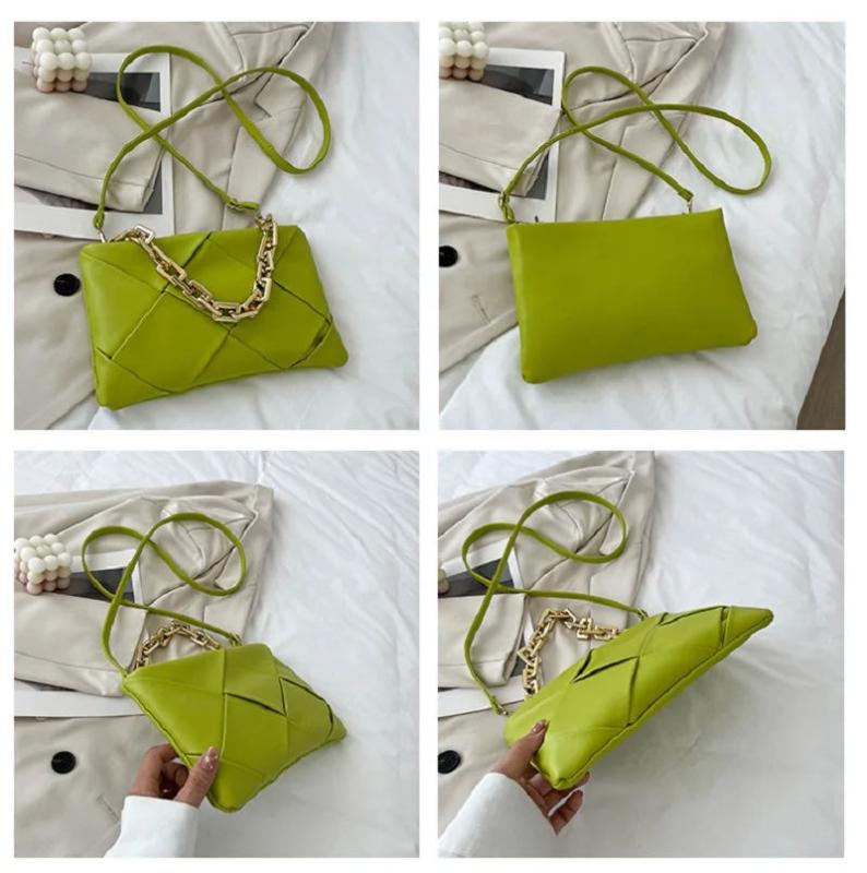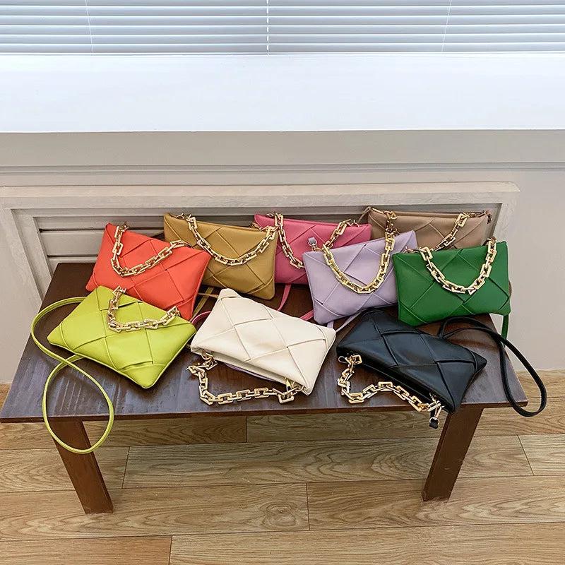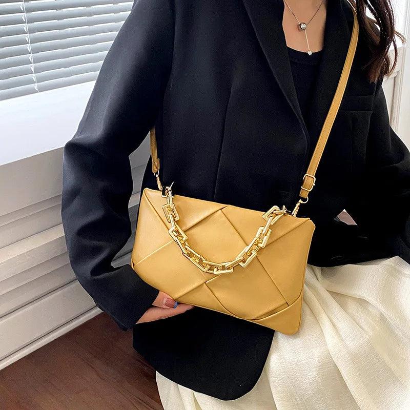 Elevate your style with this trendy and elegant crochet PU leather shoulder bag featuring a golden chain strap. Perfect for any occasion.