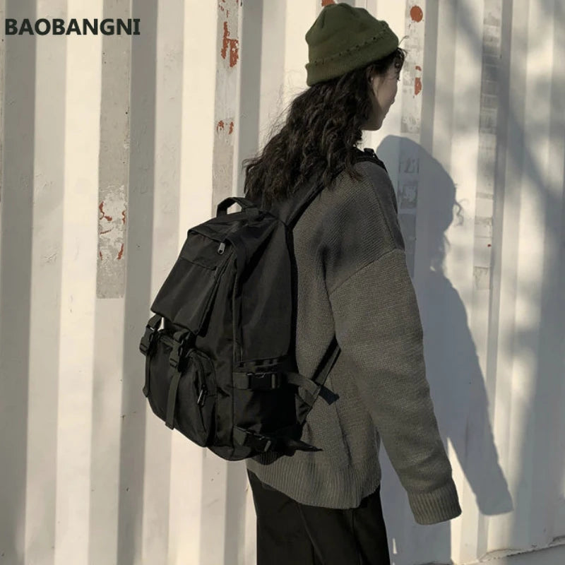 This backpack is perfect for preppy students with its retro Harajuku style and high street vibe. It offers a large capacity and button closure.