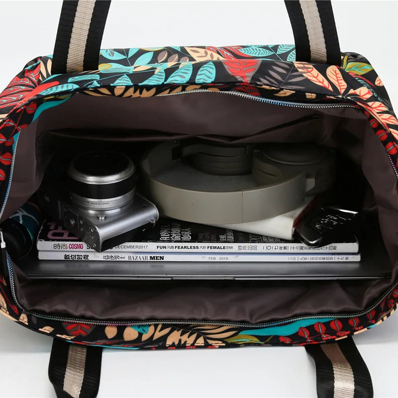 This spacious tote bag is perfect for shopping, travel, or everyday use. Made of durable nylon with a beautiful flower design, it features a convenient zipper closure.