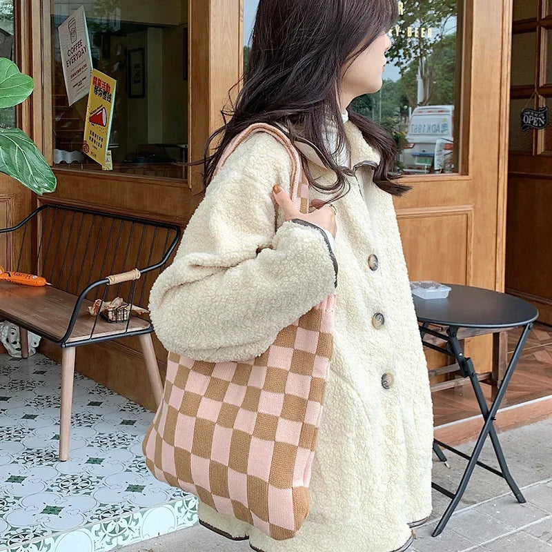 Large Capacity Women Knitted Checkerboard Bag Retro Shoulder Bags