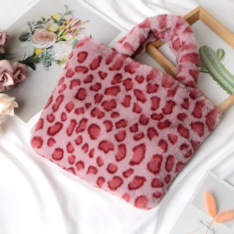 Leopard Pattern Soft Plush Shoulder Bag Winter Faux Fur Small Tote Handbags