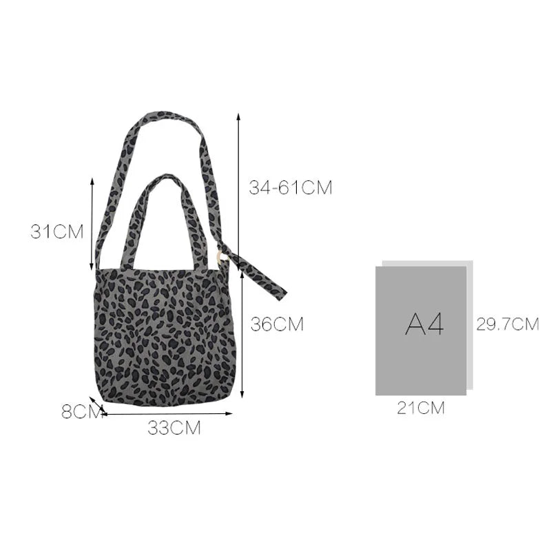 This women's handbag features a trendy leopard print design on durable corduroy material. It has a large capacity perfect for students and can be adjusted to be used as a messenger bag.