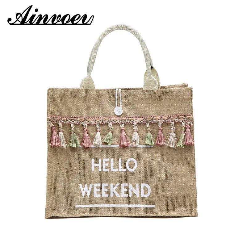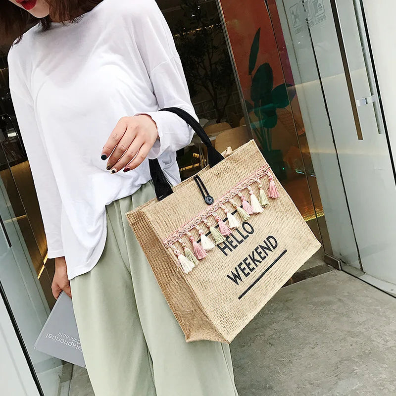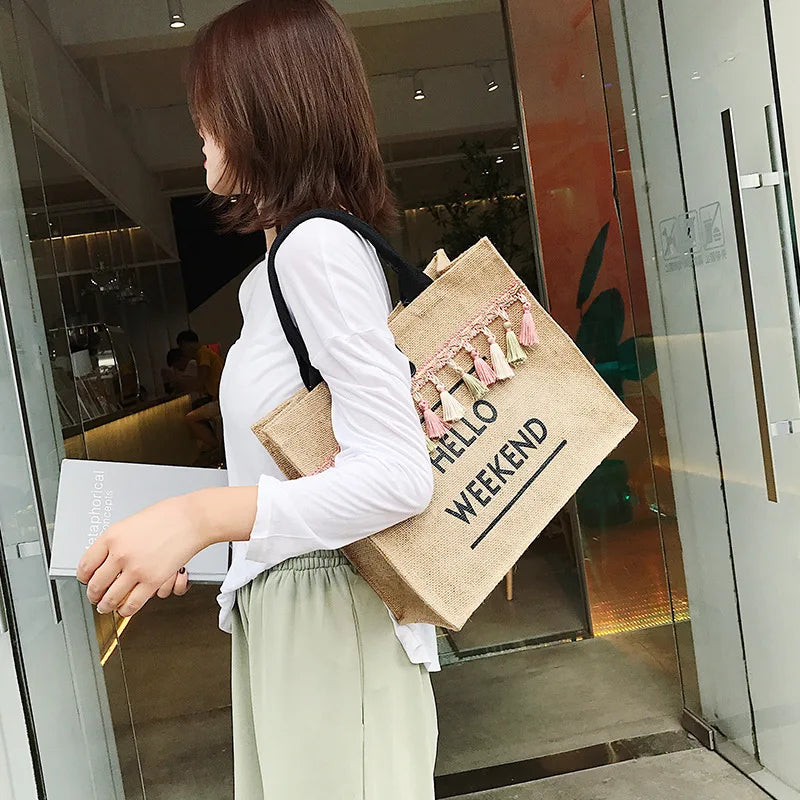 Ethnic linen handbag with tassel detail, perfect for trips to the beach or casual outings. Spacious and stylish shoulder bag for women.