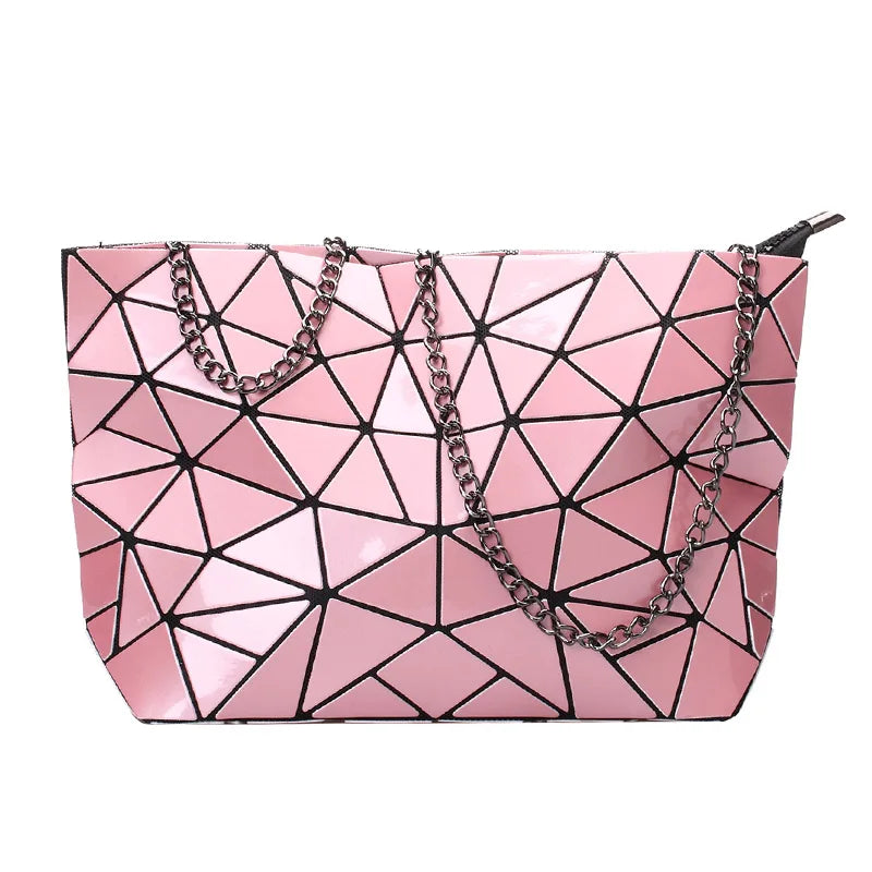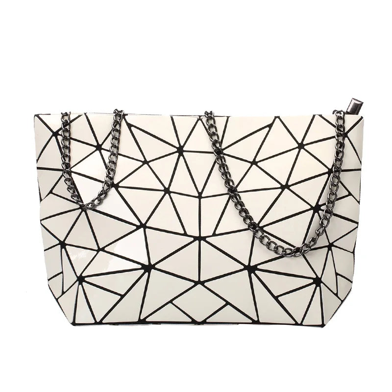 This stylish shoulder bag features a unique geometric design that illuminates in different lighting. It can be used as a clutch, tote, or crossbody bag.