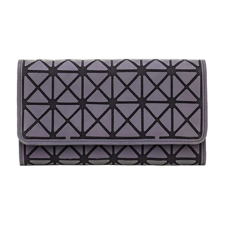 This women's wallet features a geometric diamond design with a magnetic buckle closure. It has a spacious interior with multiple pockets for organization.