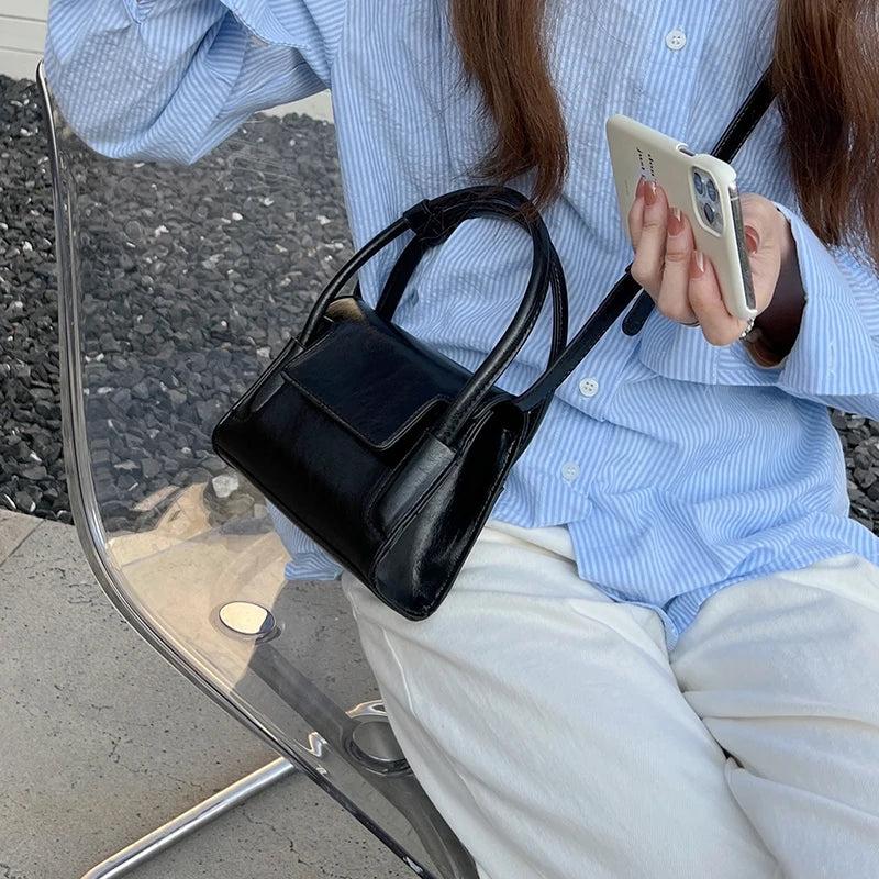 Elegant clutch purse made of high-quality PU leather with a square flap design. Features a top handle and a detachable crossbody strap.