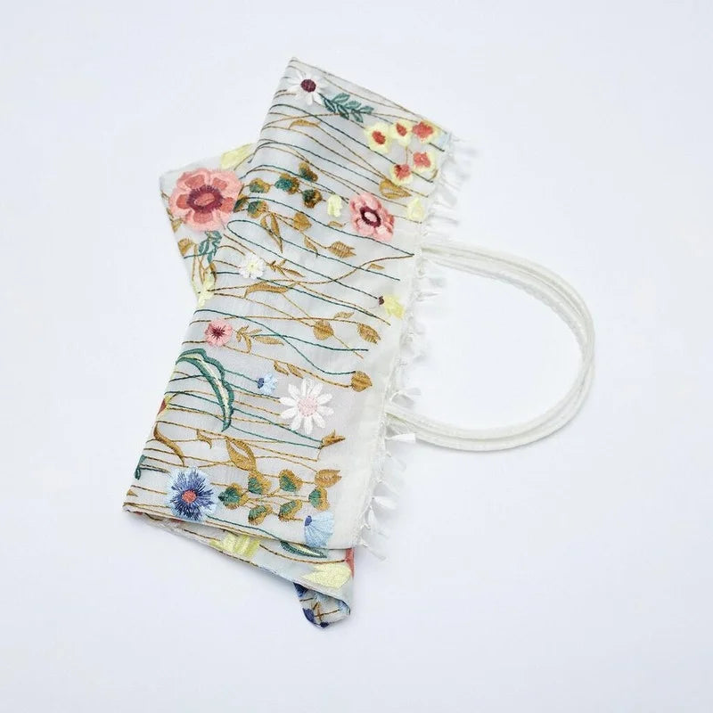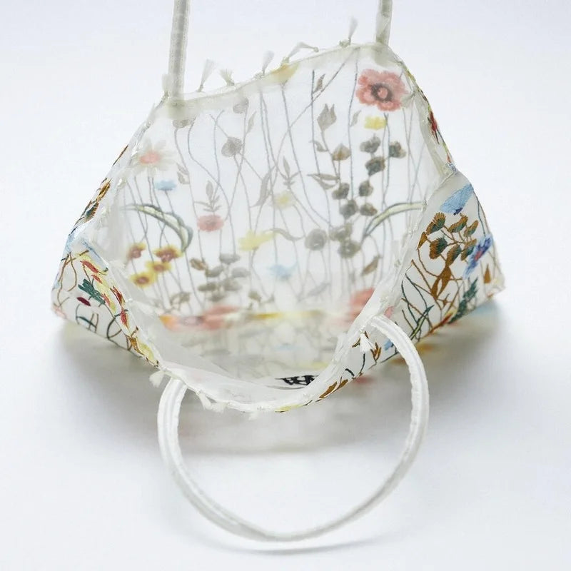 Stay on-trend with this romantic handbag featuring full embroidery flowers for a stylish summer look. The clear mesh design adds a touch of elegance to your ensemble.
