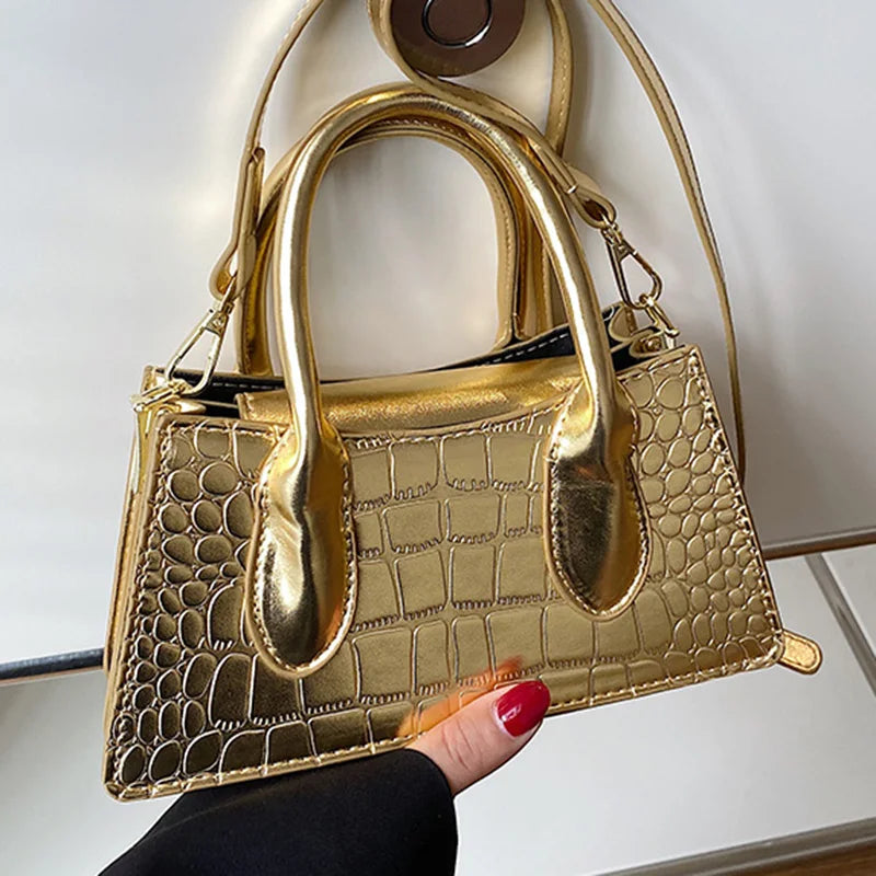Elegant crocodile pattern leather handbag in a vibrant orange color. Perfect as a clutch or shoulder bag for any occasion.